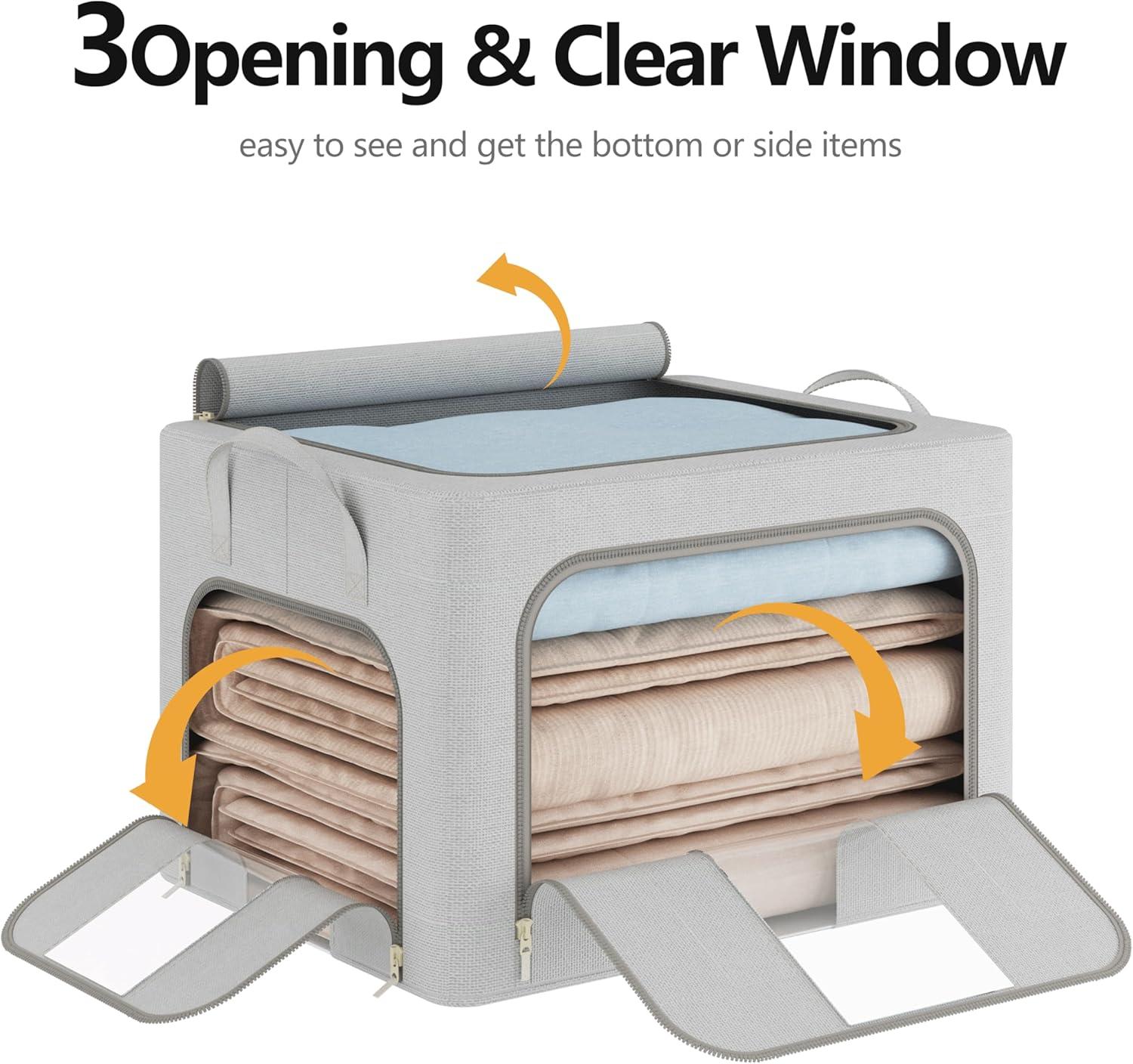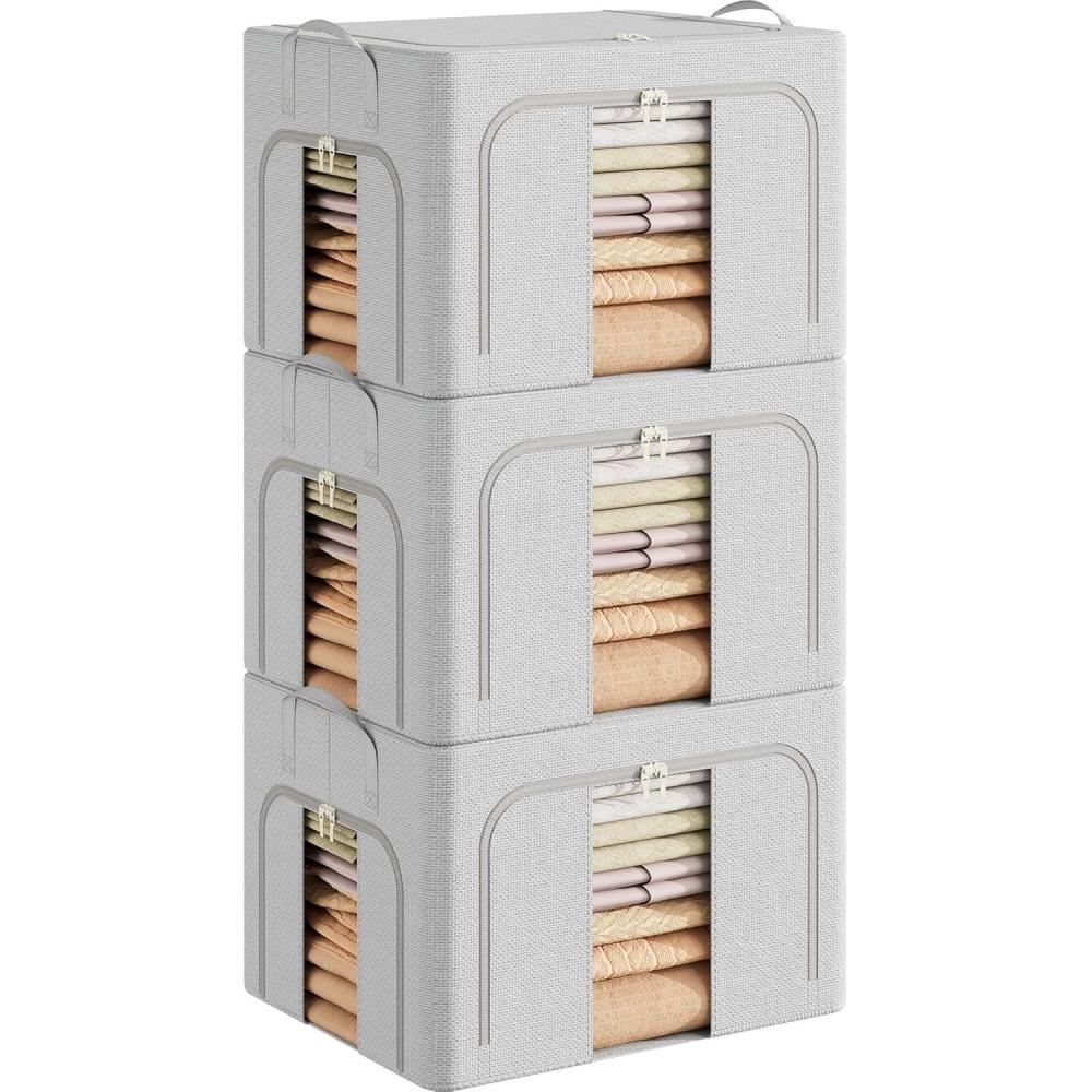 Pinkpum 3 Pack Clothes Storage Bins with Metal Frame, Closet Organizers and Storage Boxes, Stackable & Foldable Clothes Organizer Bags with Large Clear Window & Long Carry Handles, Grey Pattern 66L(Light Grey)
