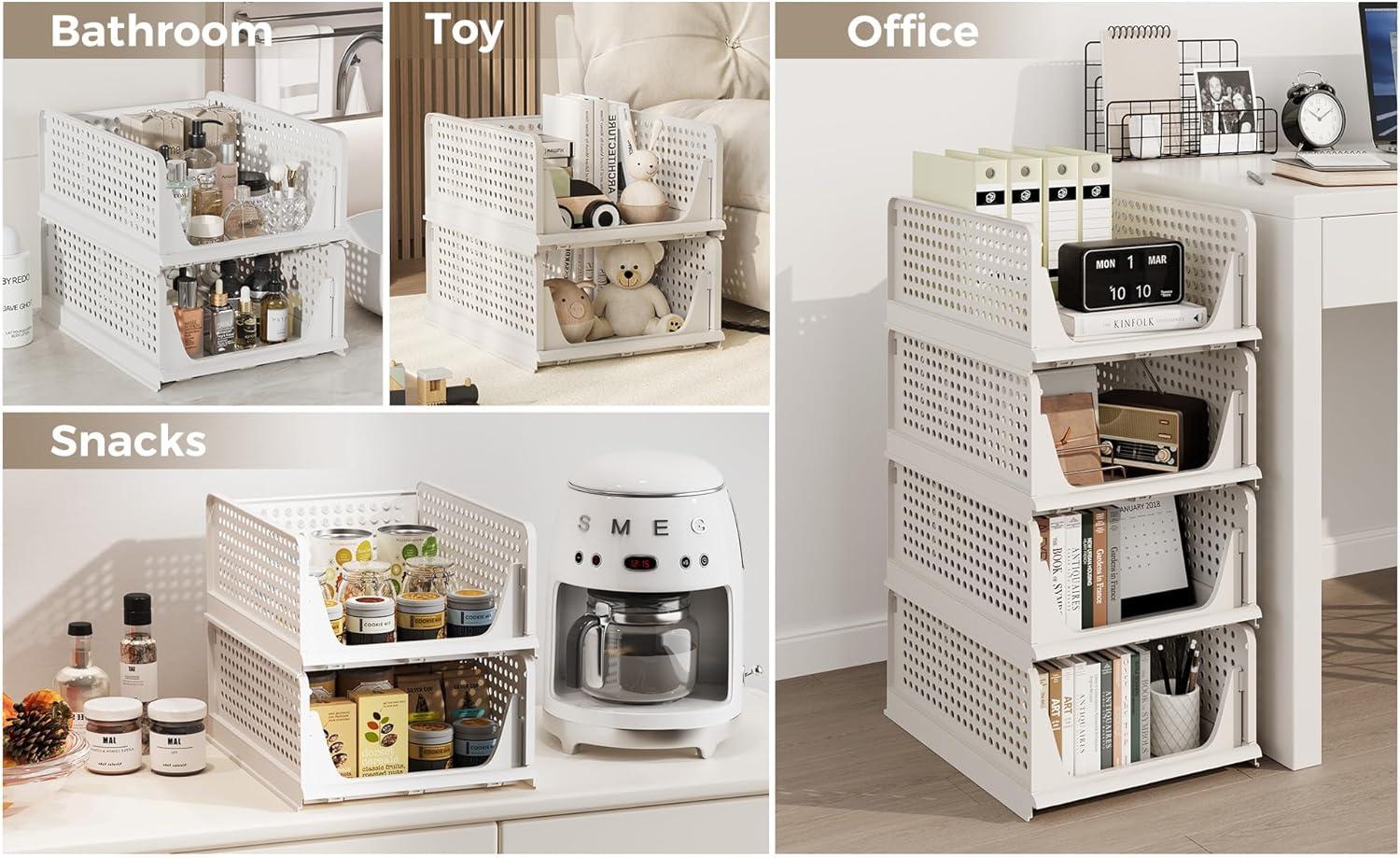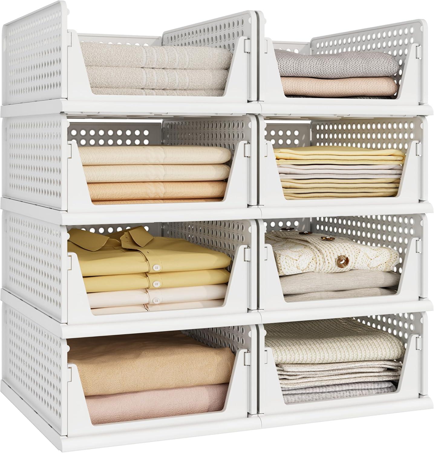 Pinkpum 8 Pack Closet Organizers and Storage Plastic Stackable Storage Bins, Foldable Drawer Shelf Storage Container for Wardrobe Kitchen Bathroom Office Dorm Grey(White)