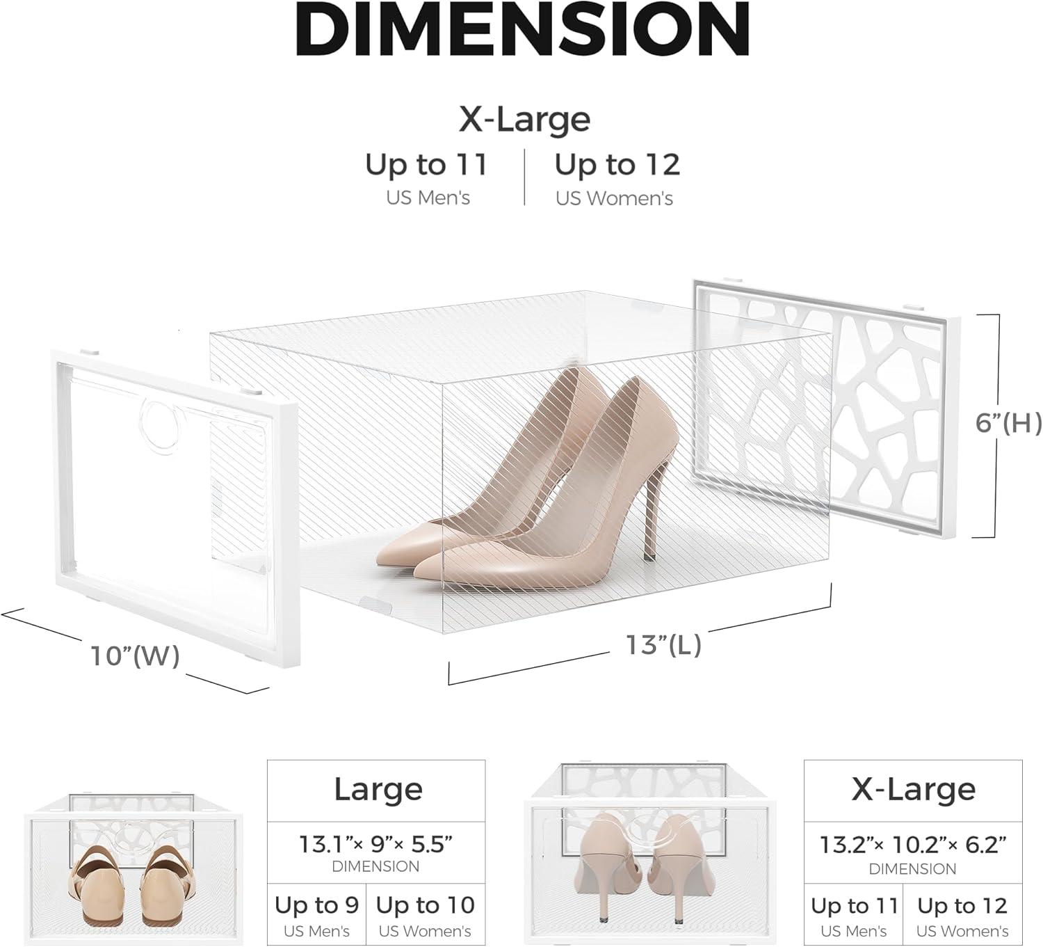 【Large Dimension】Outside-Dimension 【13.2(L) x 10.2(W) x 6.2(H) inch】, Inside-Dimension 【12.2(L) x 10.2(W) x 6.2(H) inch】. Shoe Organizer fit for men's size 11 / women's size 12, you can store sports shoes, high heels, sandals, slippers, etc.