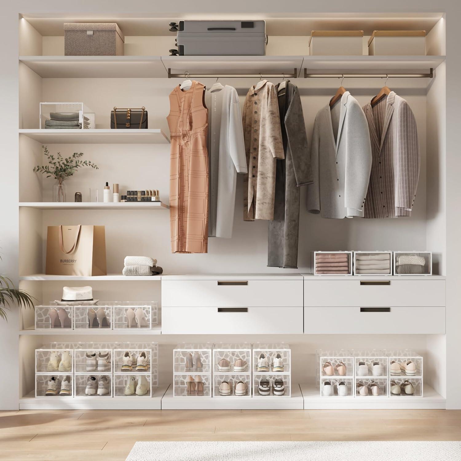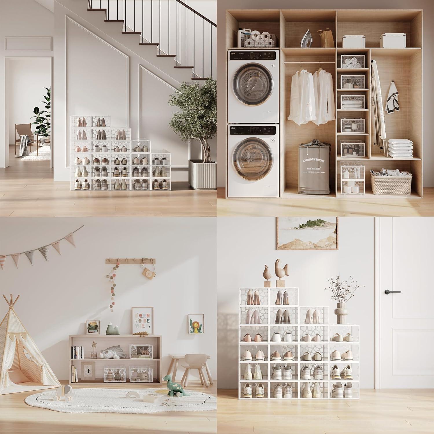 【Stackable】Make the most of your home space. Shoe box can be stacked into any shape you want, because of bottom of shoe box has a stacking design. it can be placed in the living room, garage, bedroom, wardrobe, closet, or even in a corner where space is tight.