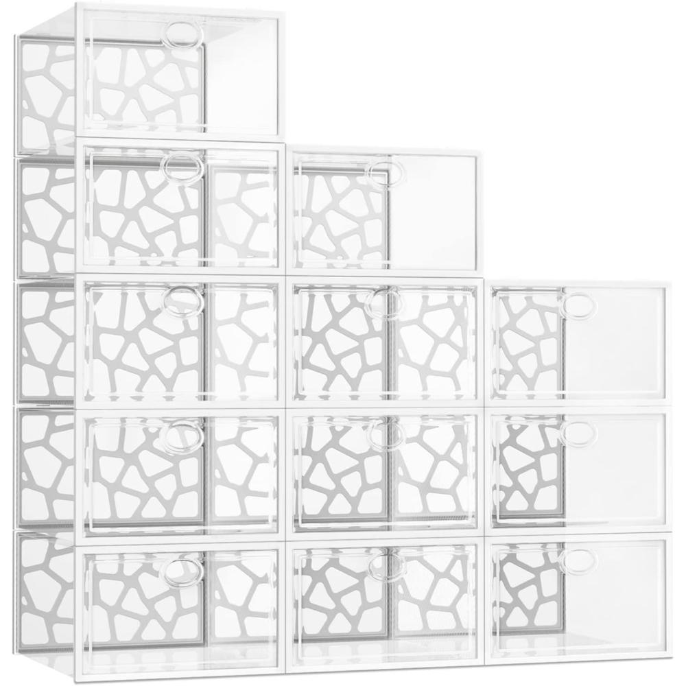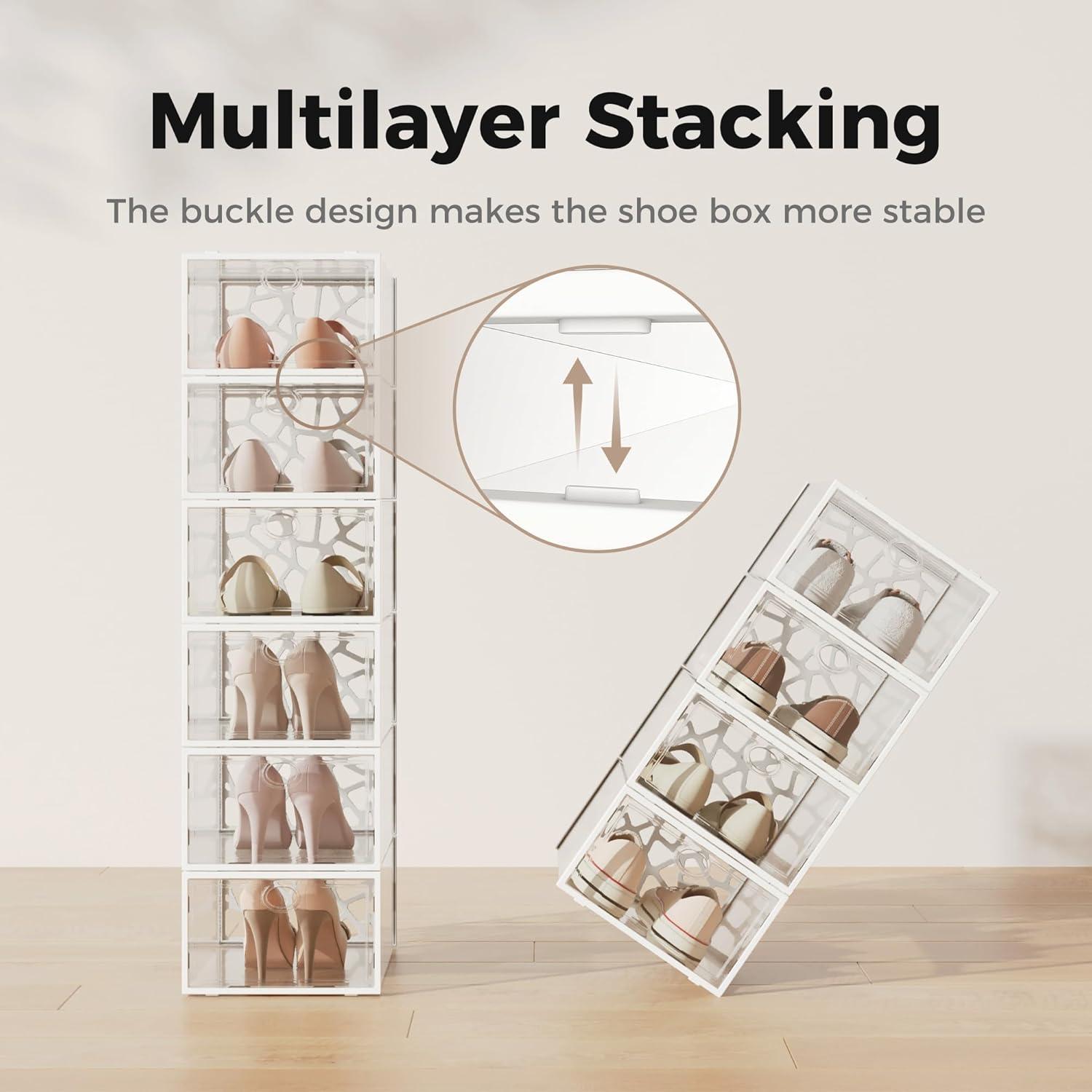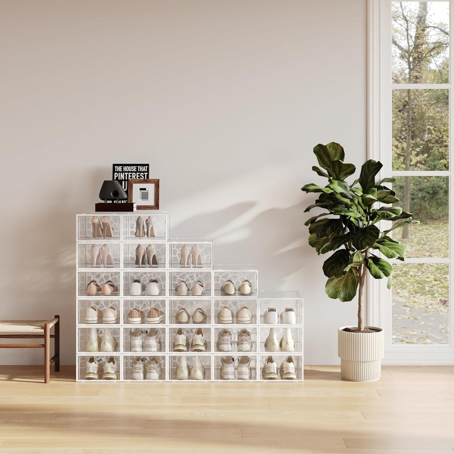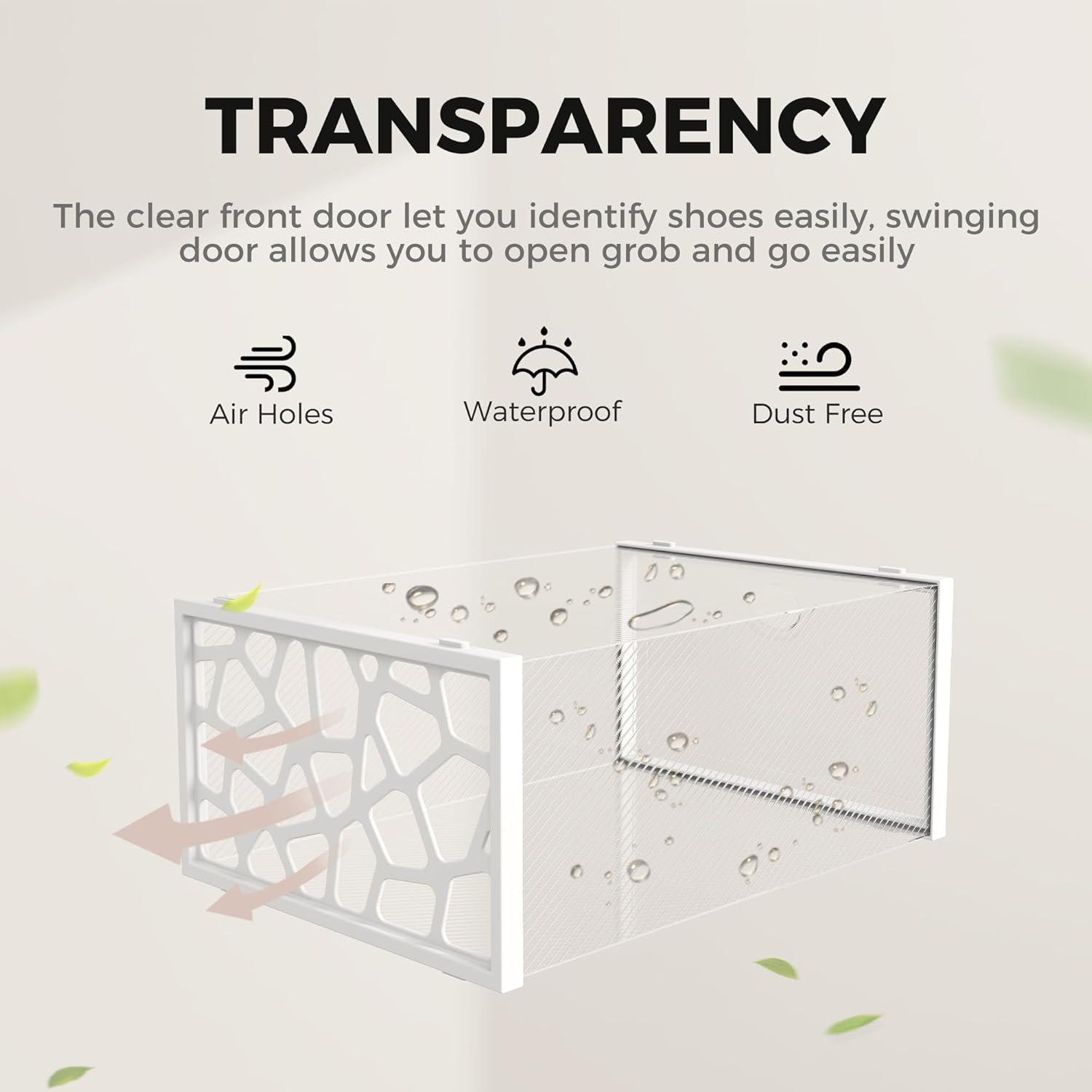 【Clear & Sturdy 】Made of durable PP and sturdy ABS door frame, this clear plastic shoe box is transparent, sturdy and will not deform.It is a shoe box designed by pinkpum's design team over several months. Its unique back hole pattern solves the problem of most shoeboxes not being breathable, but still remaining dust free.